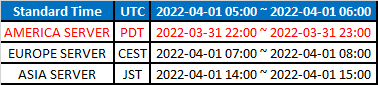 The following patch note pertains to contents that will be updated during the (UTC+0) April 1st, 2022 Emergency Maintenance. Maintenance will happen during the following times: