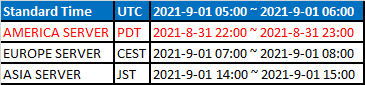 The following patch note pertains to contents that will be updated during the (UTC+0) September 1st, 2021 Weekly Maintenance. Maintenance will happen during the following times: (*Above time periods are subject to change. In case of schedule change, we will update this announcement.)
