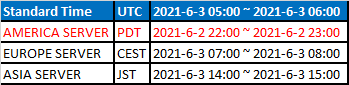 The following patch note pertains to contents that will be updated during the (UTC+0) June 9th,2021 Weekly Maintenance. Maintenance will happen during the following times: