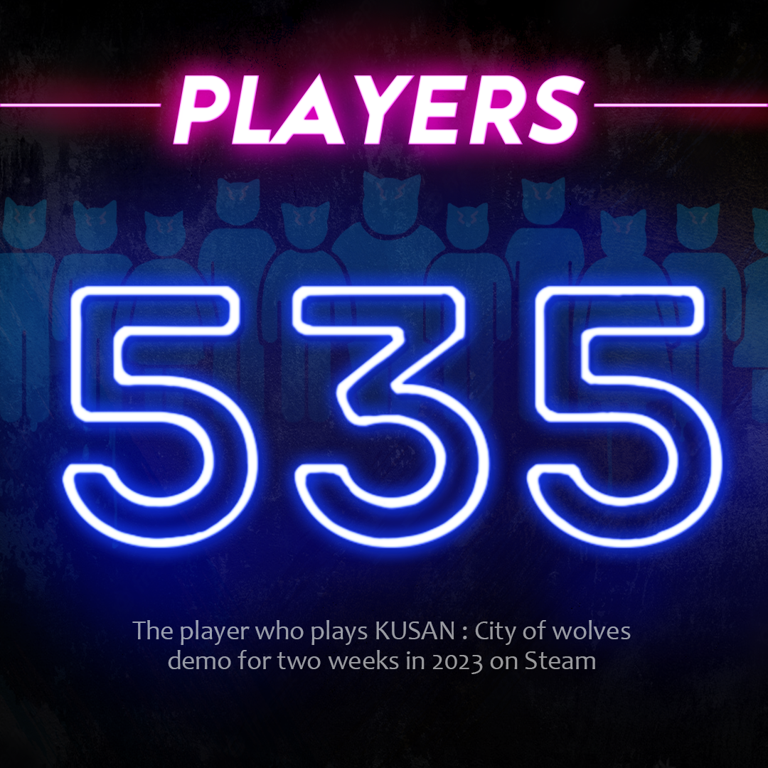 * Join Open play test: 535 people * Hotline Miami or Katana Zero awareness : 90.6% * Gameplay satisfaction : 4.5 / 5.0 * Positive reviews : Hit impact, Art, Sound Effects, Story * Difficulty of Missions: 48% Balanced, 41% Hard, 7% Very Hard * Difficulty of Boss : 38% Balanced, 35% Hard, 14% Very Hard * Purchase intent : 98%