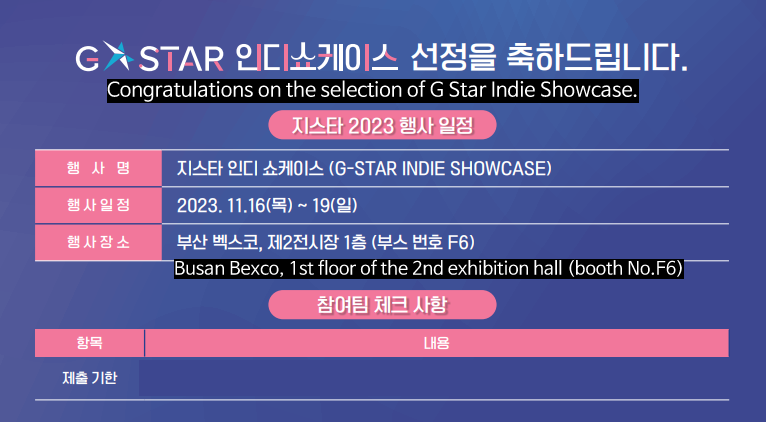 Thanks to your support, We can participate in the G-Star indie showcase in November.