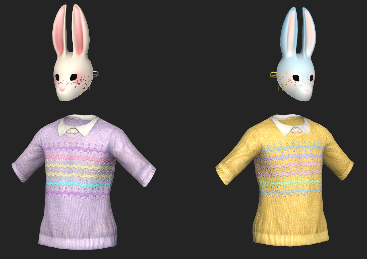 As well as the above, we have 3 new outfit sets (each set is clothing + mask). There are two regular easter themed outfits:
