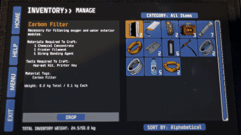 Added Charged Backup Battery items that can be used to recharge your suit while out on an EVA, which after using will change to either a Discharged Backup Battery or an Expired Backup Battery in your inventory. A Discharged Backup Battery can be recharged at a crafting bench as long as there is enough reserve battery charge in the habitat, and an Expired Backup Battery will no longer hold a charge and is only useful for salvaging other materials from it. The chance to become an Expired Backup Battery is 1 in 20.
