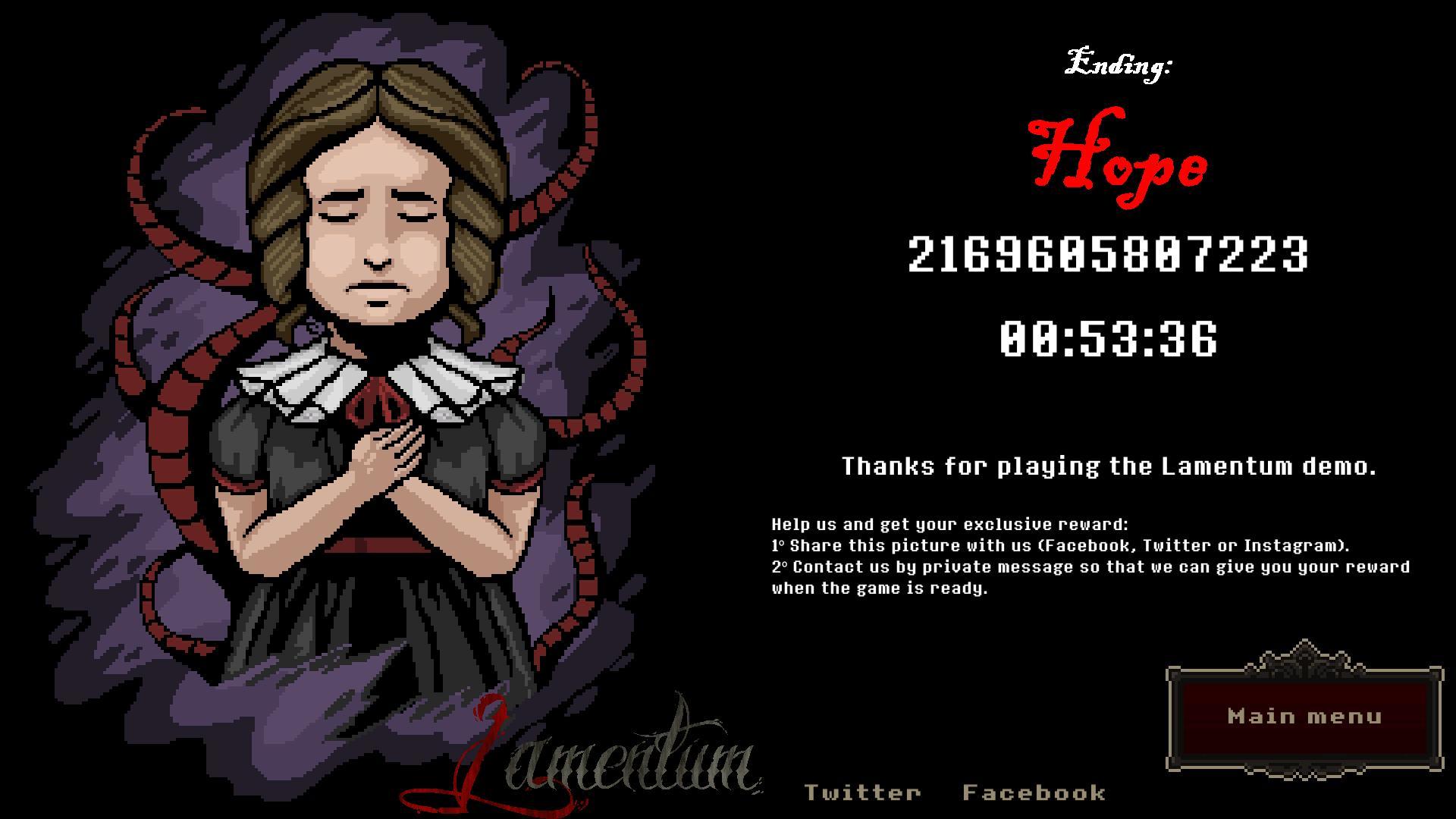 However, the first 5 who achieve the hidden end (Ending: Hope) will also get a digital copy of the game, a digital copy of the original OST of Lamentum and will have an exclusive picture in a special place of Grau Hill.