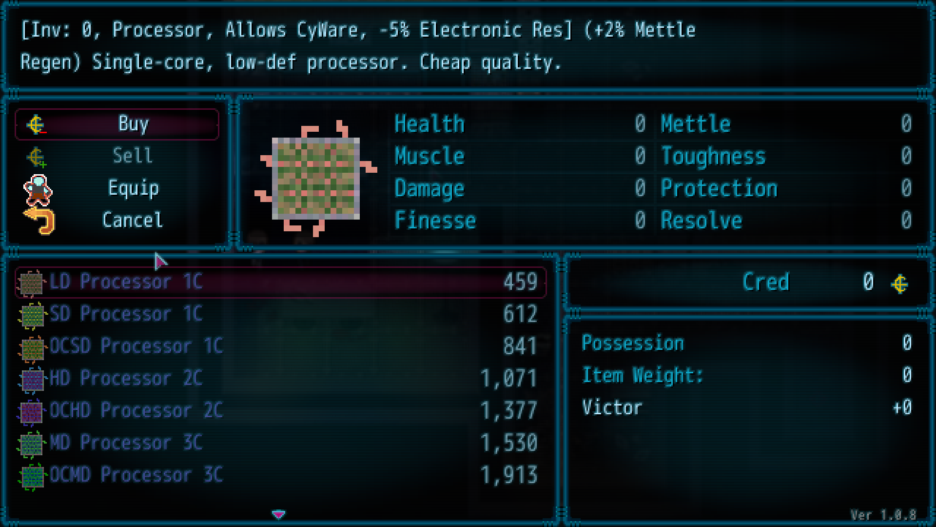 As far as the content that I've added so far, I have implemented a working, fully-rounded cyberware upgrade system. By my count, there are 35 different cyber upgrades that you can get at the moment. I have many more ideas that will be added as well, but 35 is pretty good to start us off. I also added the very first cyber related skill which comes from one of the optical upgrades called "Blinker Flash". Basically, your cyber optics emit a sudden, bright flash similar to a flashbang, but a little less effective. The ability can blind and even confuse your foes. Many (many, many, many) more abilities are planned, but for now, this is what I've added. I've been focusing on the actual upgrade system first to get everything in place.
