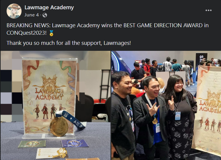 The most recent achievement for Lawmage Academy was winning the “Best Game Direction Award” in CONQUEST 2023, a huge event in the Philippines featuring artists, streamers, events, and games. It was unexpected since there were so many amazing games in CONQUEST 2023. I think Lawmage Academy did so well because I decided to learn pixel art and listen to player feedback in the earlier versions. I could not have reached this point without everyone’s help and encouragement.