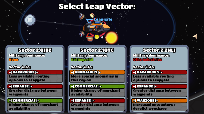Leapgate target sector traits - when leaping to the next sector, 3 choices are available, with the sectors having traits selected from a pool of options. The traits can influence a range of things, from scanning range to event likelihoods, so the player will need to weigh up the best choice for their current situation. In addition, the military dominance tag influences the opposition in the sector (and will also influence friendly events, to be implemented).