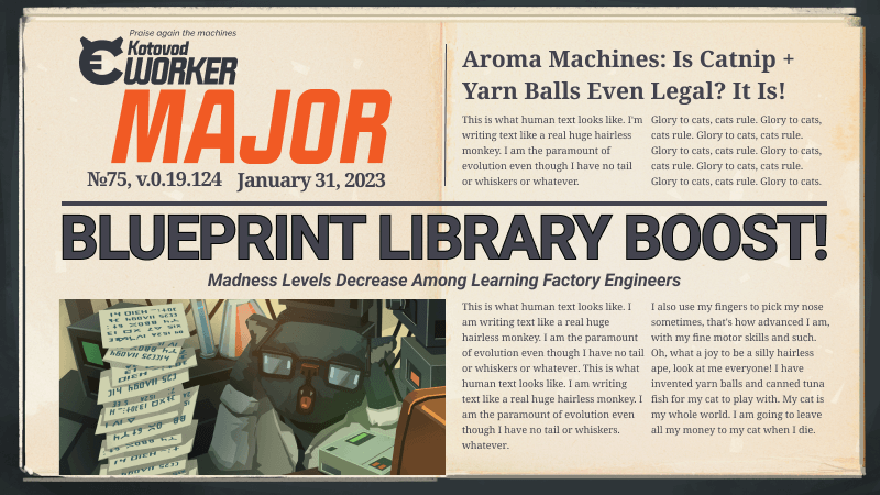 Speaking of what we're working on now, we must get back to the players comparing our game with Factorio. (Are there really many factory building/optimization games that don't look like Factorio?) We'd really like to highlight what's making Learning Factory unique, that's why we're working on an additional version of the game's tutorial, specifically made for factory-building connoisseurs. This way you'll be able to get past the basic stuff like laying down Transporters and mining basic resources, right into serious cat-catering and data processing stuff!