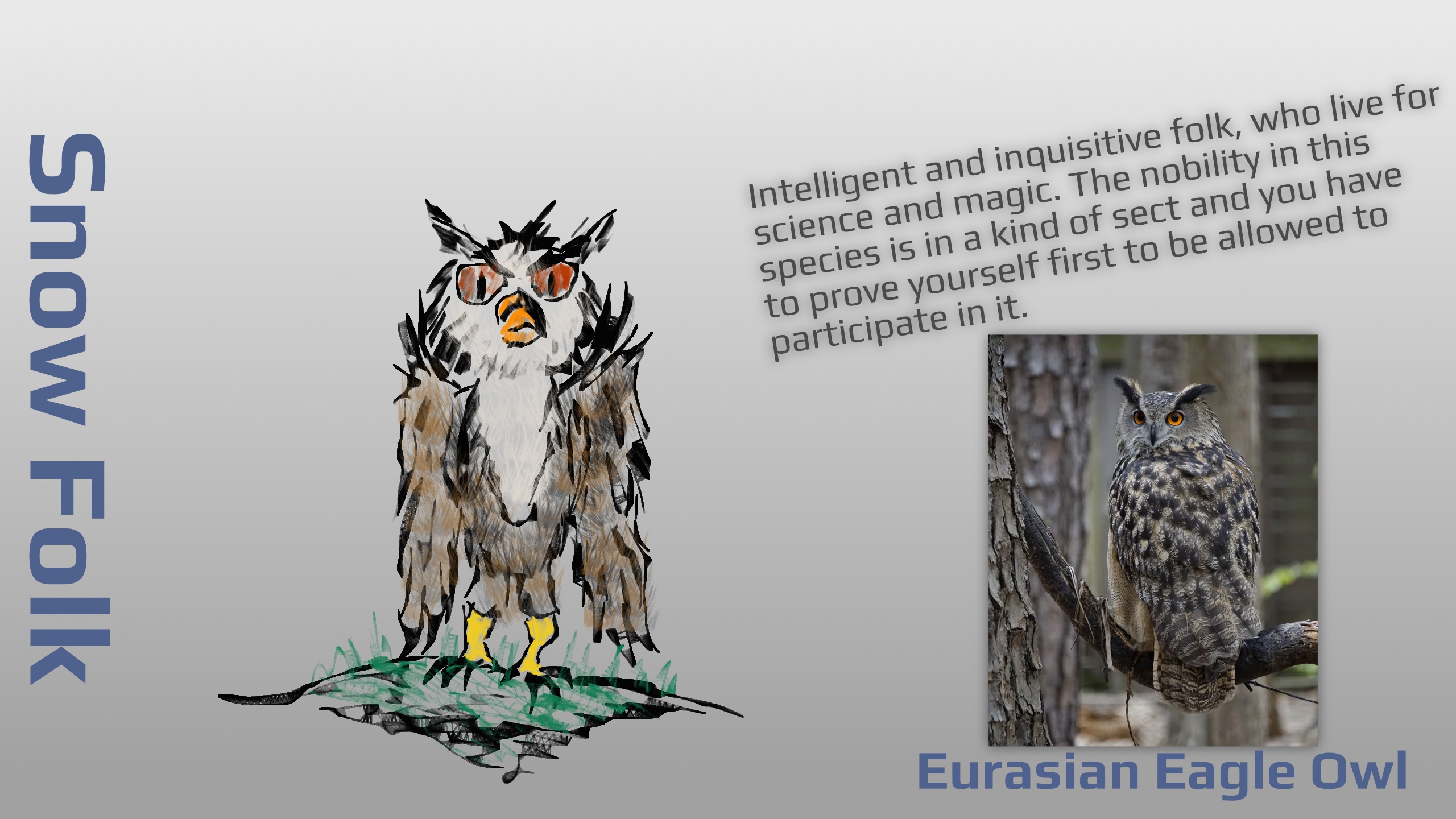 I want to start with the snow folk, which can be found mainly in the north. The Snow Folk is based on the eurasian eagle owl, which for me is a very intelligent and mysterious animal. These qualities, I have incorporated into my concept, so the owls are an intelligent and knowledge-hungry folk. Therefore, they live for science and also have points of contact with magic. They don’t let everyone into their territory. One must first prove to them that one is worthy to move and act in their territory. For outsiders, this first seems like a cult, but it’s a kind of defense that you only recognize once you can explore more of it.