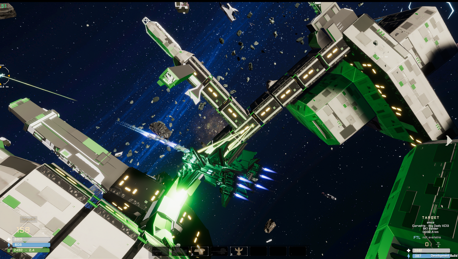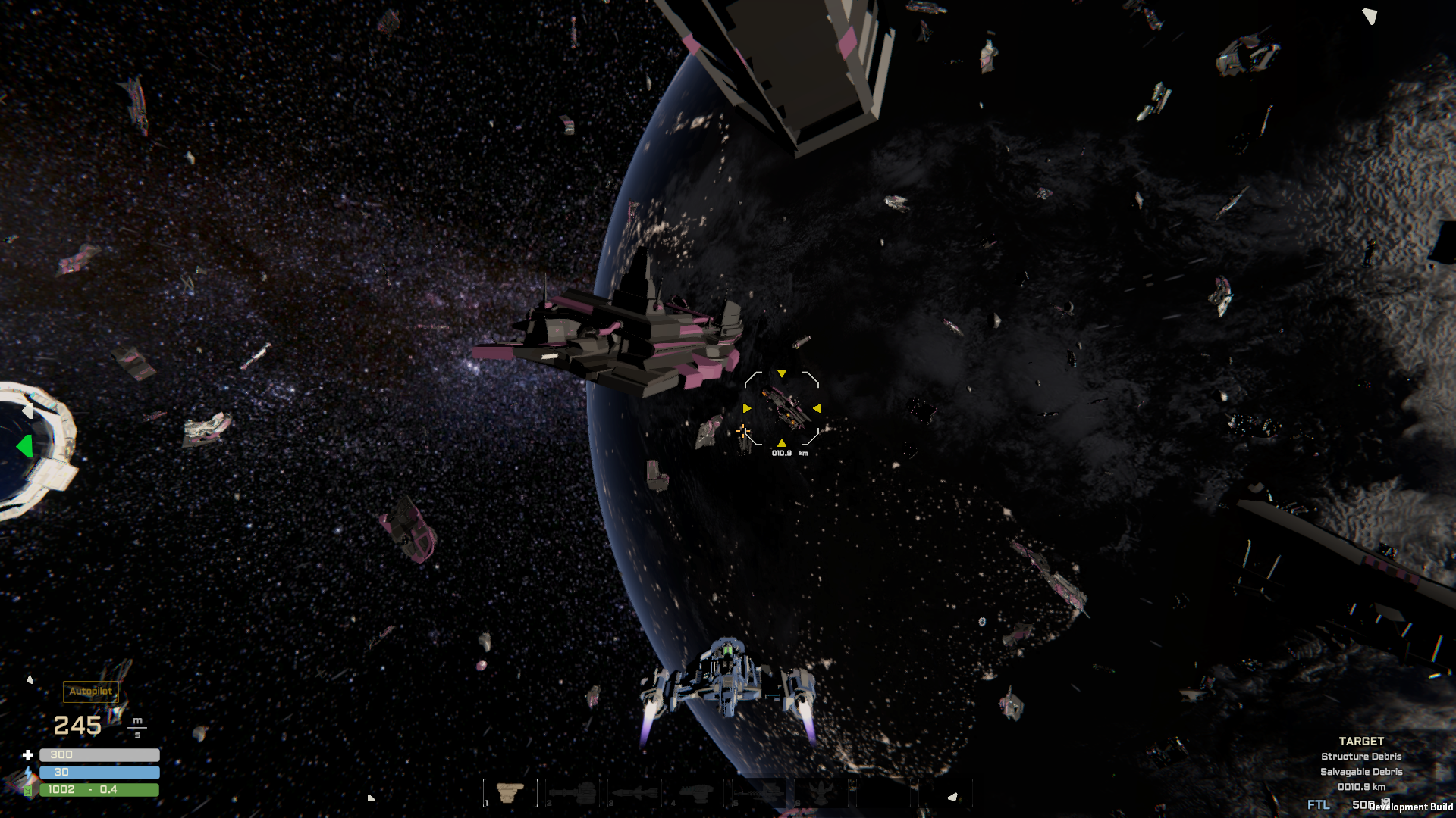 Debris and derelict ships will drop various building parts and resources depending on their type. The drop is small and intended to give you some initial upgrades. Since there is no way to process resources into building parts yet and there is no other content you will still start with some building parts in your inventory for testing purposes. FTL jumping is also enabled by default and costs no fuel.
