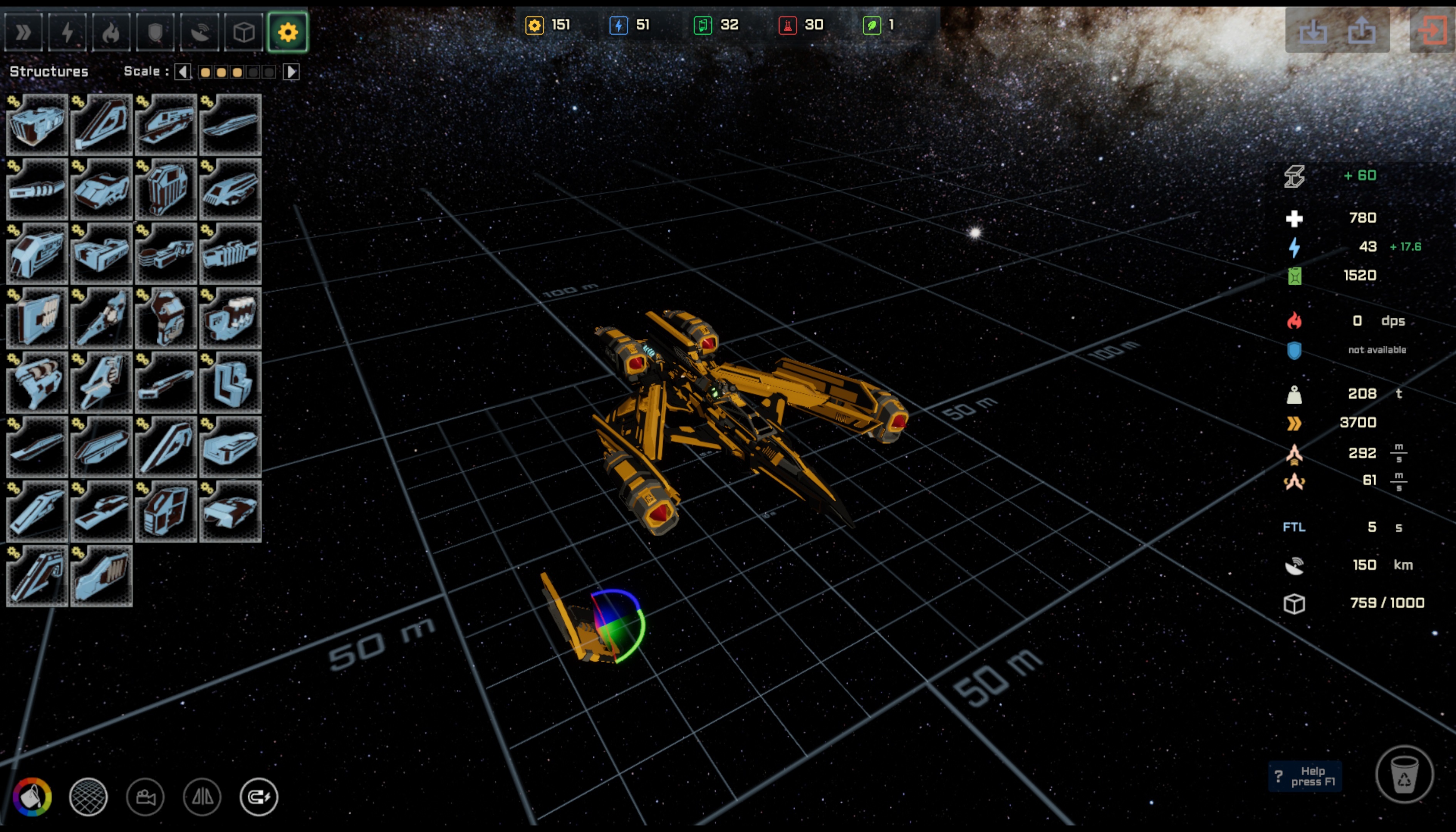 Ship editor now uses building parts from new resource system. We have also reworked and improved most of the editor features. Hopefully providing more streamlined and easier to understand interface. New features have also been added. Help overlay that explains functionality that can be turned on with F1. You can now rotate ship parts via right click context menu. Automatic snapping to ship surface can be toggled on and off. Along with improved dragging of parts (they are picked at the point under cursor), this allows for much more precision and creativity with ship designs. Last but not least, you can undo changes to the ship via Ctrl+Z up to five steps.