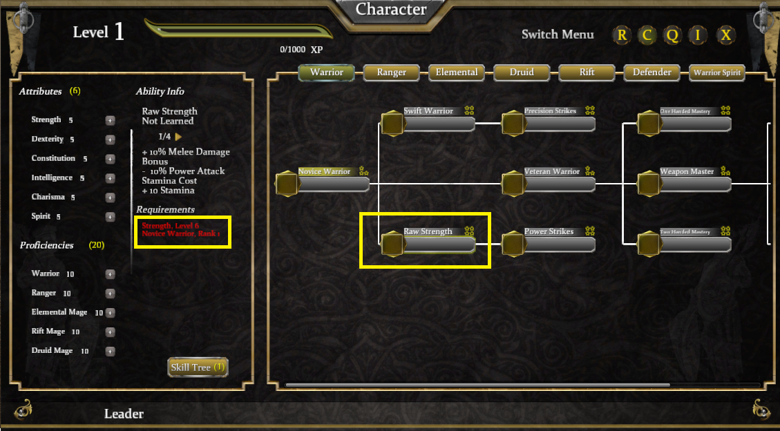Whenever you decide which class you want to dig deep into, you must spend enough attribute and proficiency points in it. For example, a Warrior will need enough strenght and proficiency points to unlock those skills. The more points you spend, the better the skills in its tree will be unlocked. For instance, the "Swift Warrior" skill will give you + 10% critical damage, +10% melee attack speed, and will unlock further skills that will stack to give you quick and deadly strikes, while the "Raw Strength" skill tree will unlock slower but more powerful melée attacks.