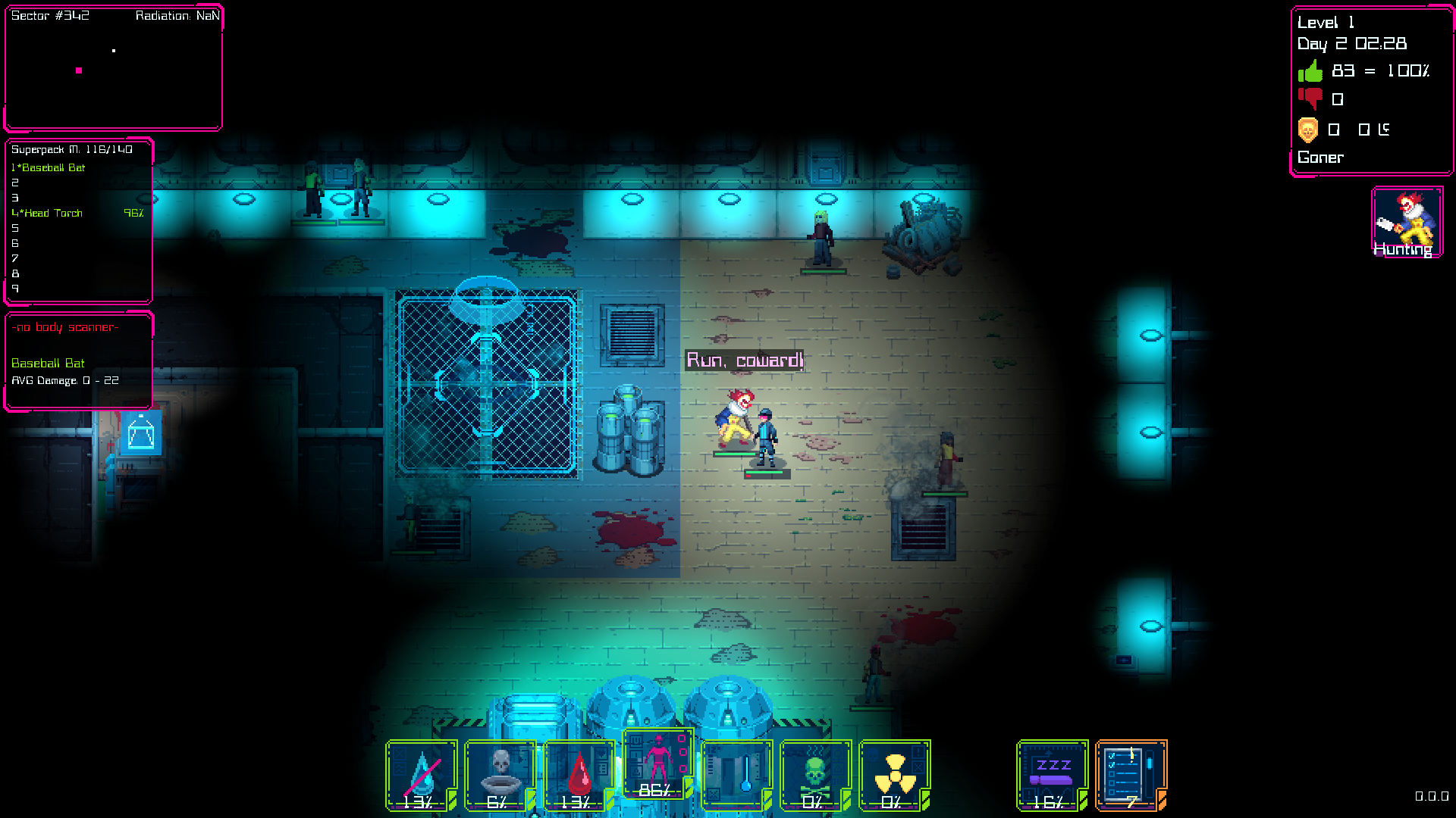 Play in a beautiful handcrafted pixel art world. Procedurally generated levels mean no run is ever the same. Tread carefully, because permadeath is on your trail. Buy and implant stims to upgrade your skills and increase your chances of survival. Talk to people – maybe they'll help you… Some run the black market and have useful gear for sale. Some will shamelessly rob you while you sleep. Pump a load of lead into that stupid laughing Clown!!!