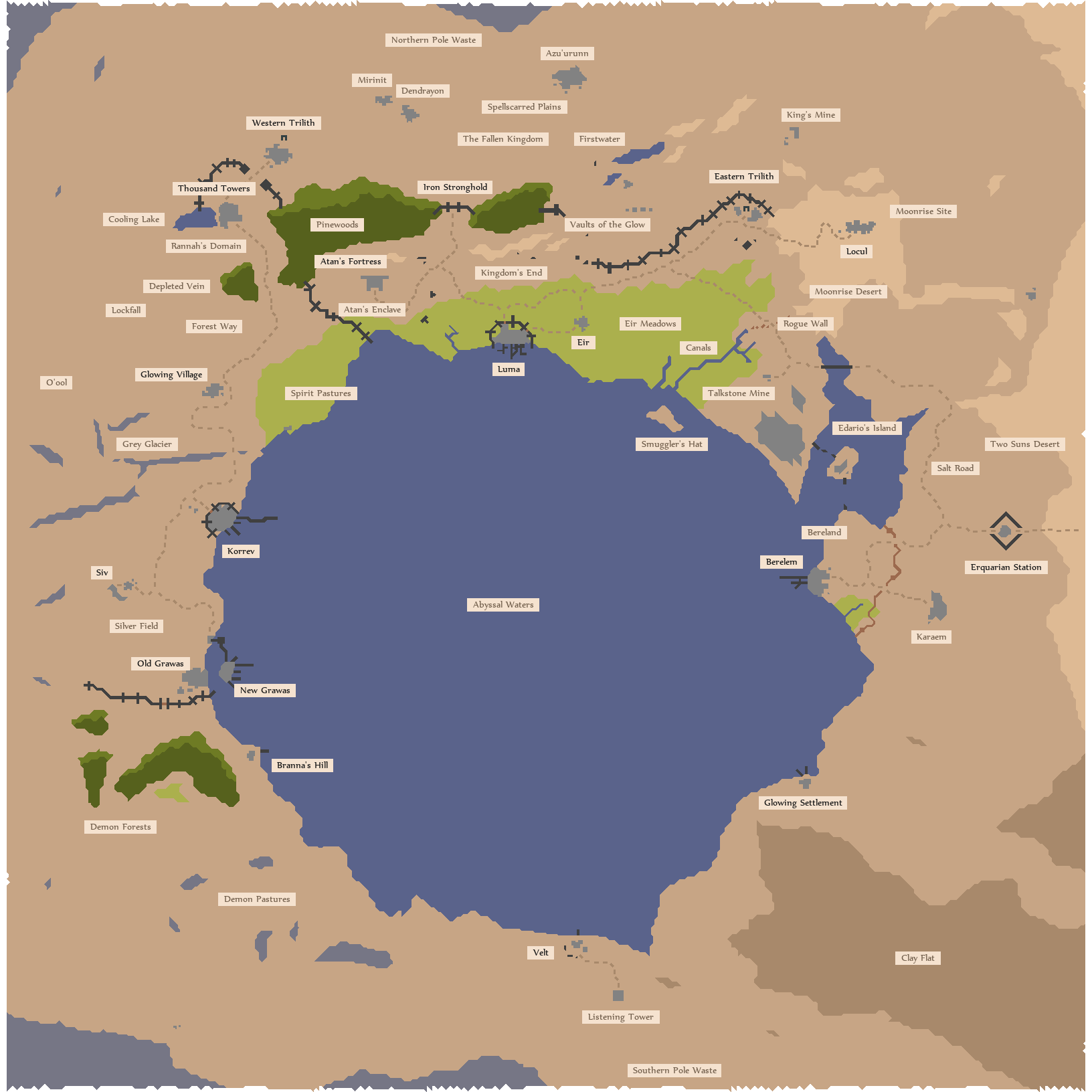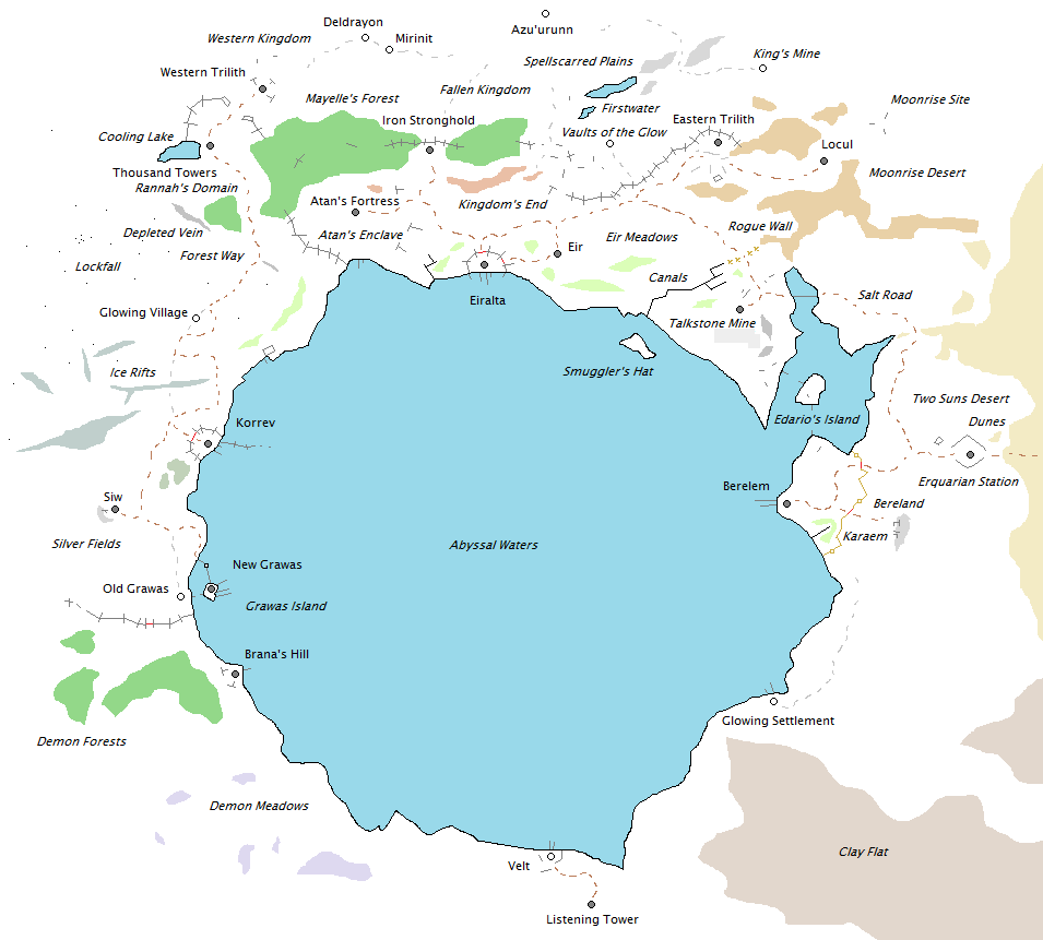 - Desert: Moonrise Desert, Two Suns Desert, Berelem, Salt Road. - Steppe: The Fallen Kingdom, Triliths, Kingdom's End Battlefield. - Meadow: Eir Meadows, Crossroads, Kingdom's End, Atan's Enclave, Luma, Eir. - Field: Rannah's Domain, Lockfall, Silver Fields, New Grawas, Old Grawas, Korrev.
