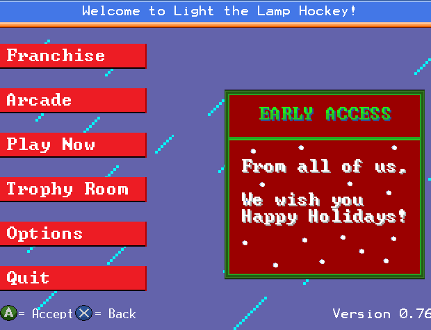 Sounds and Aesthetic Changes -New Sound FX added for Shooting, Poke Check, Passing, Board impacts. Also a new menu song! -Graphic changes to Main menu and Title Screen. -Music will now shuffle in menus.
