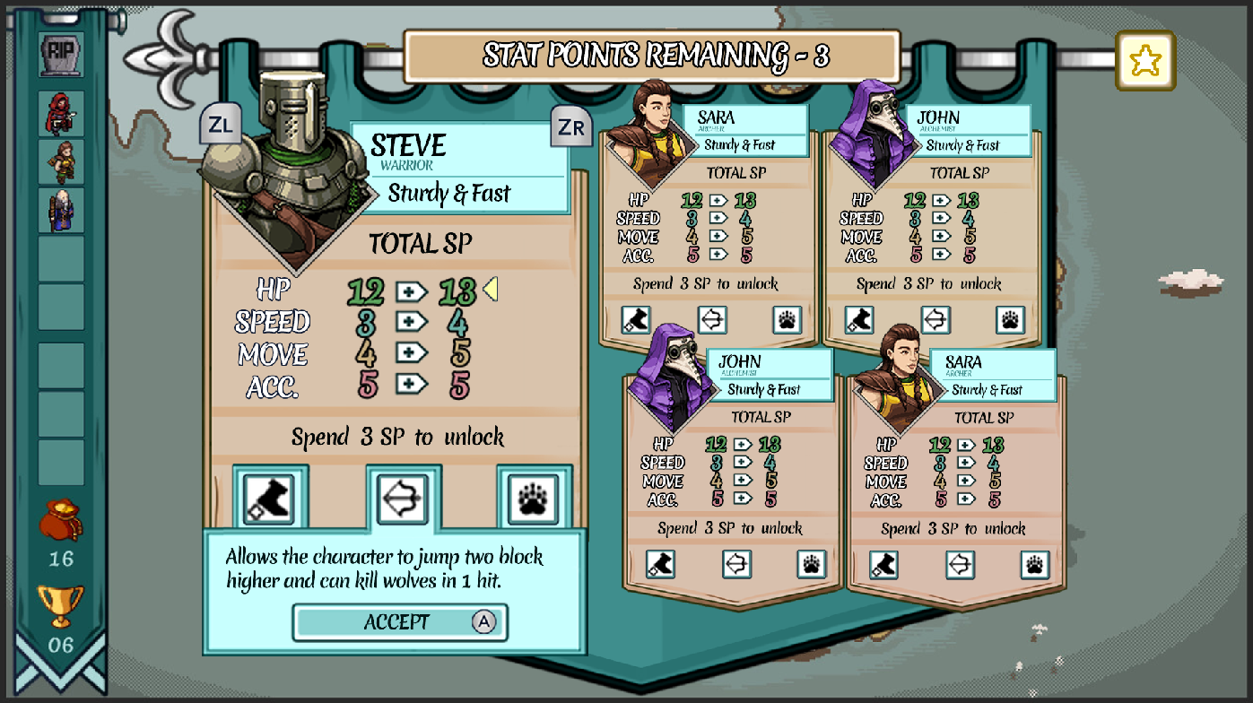 Adventure Stat Points! A whole new Stat Point system has been added into your Adventures, allowing you to upgrade the Health, Movement, Speed and Accuracy of each of your party members using points earned from battling. Each party member also comes with their own stat-affecting Attitude which is revealed upon their recruitment to your team.