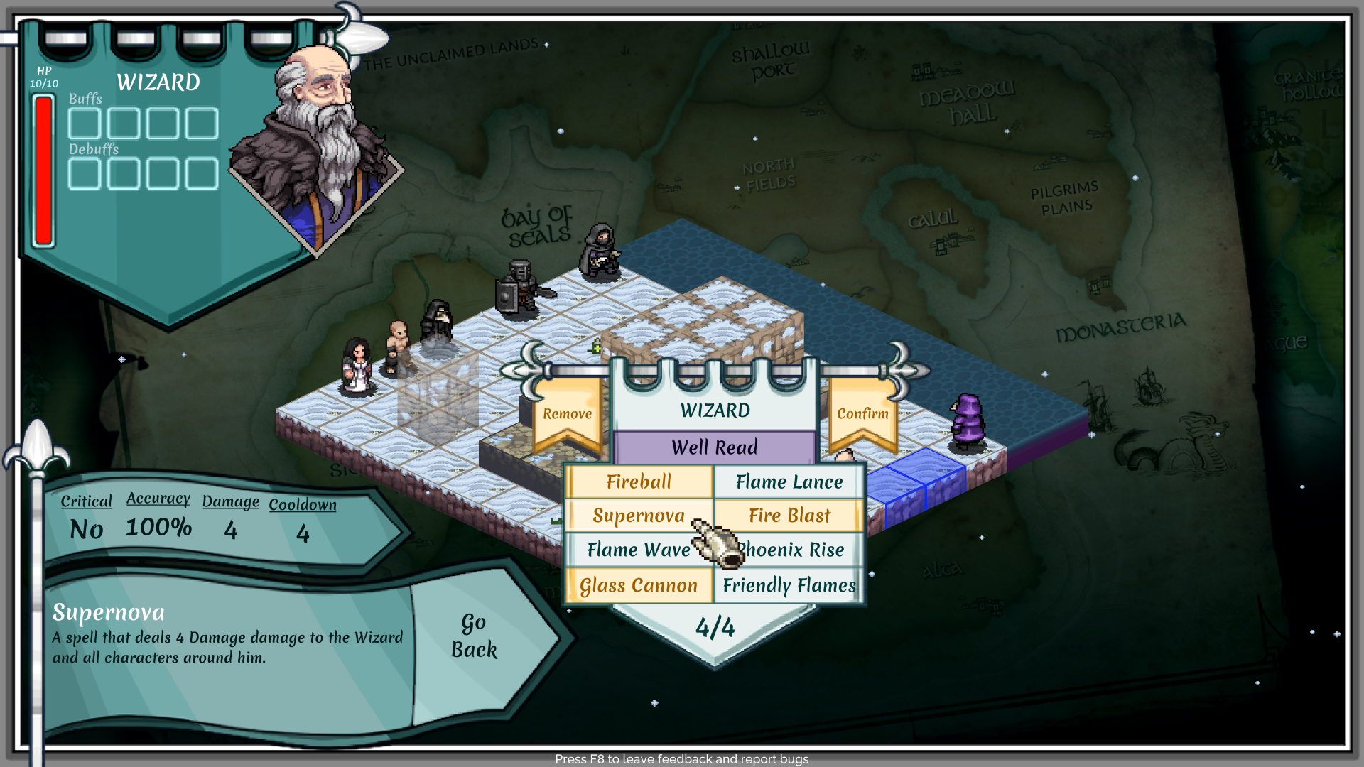 Wizard - Glass Cannon – The Wizard gains +2 movement range but max HP is reduced by -2. - Friendly Flames – The Wizards spells no longer also damage teammates.
