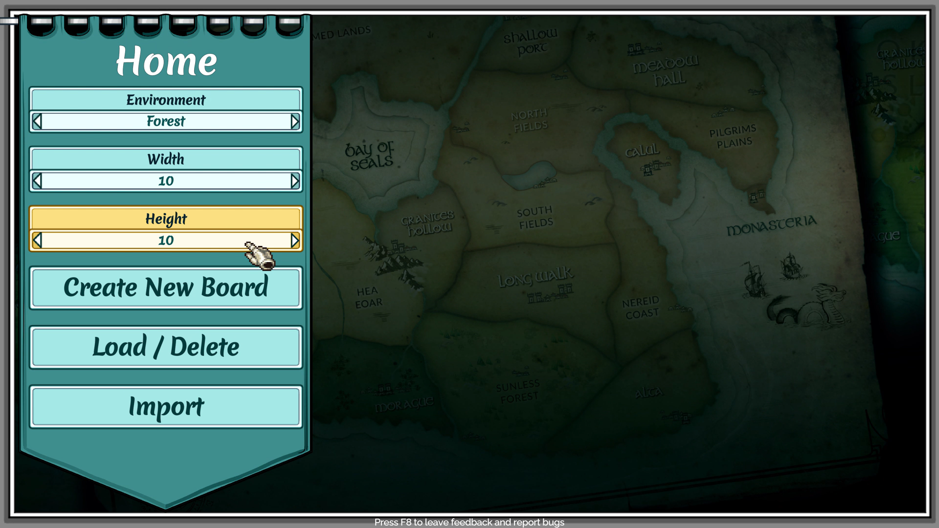 1. Choosing your environment and board size. Environment determines the starting ground tiles and some other smaller factors that aren't too important. Ground tiles essentially come in two groupings, outside and indoor, its easy to tell what type of tiles you'll have access to within a few moments of trying out the board builder. From this screen you can also Load a previous board you've worked on as well as ALL the other boards in game and customize them how you want. Import allows you to import a board from someone else, more on that later.