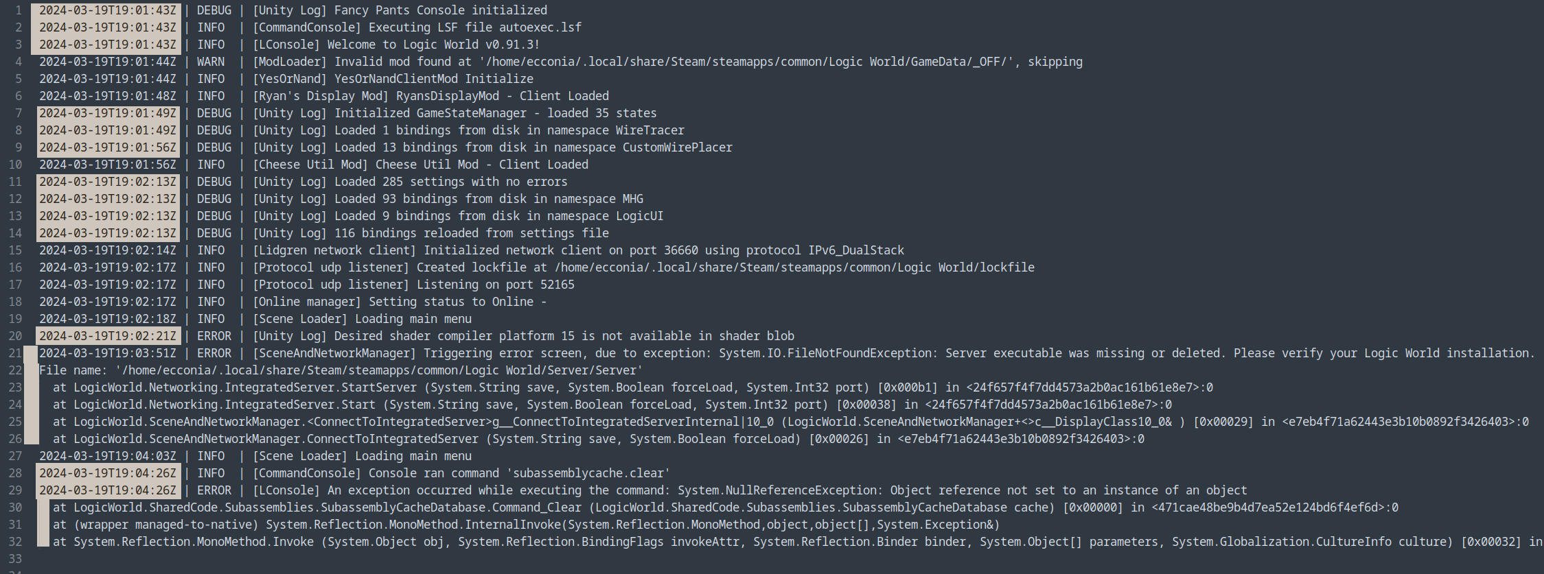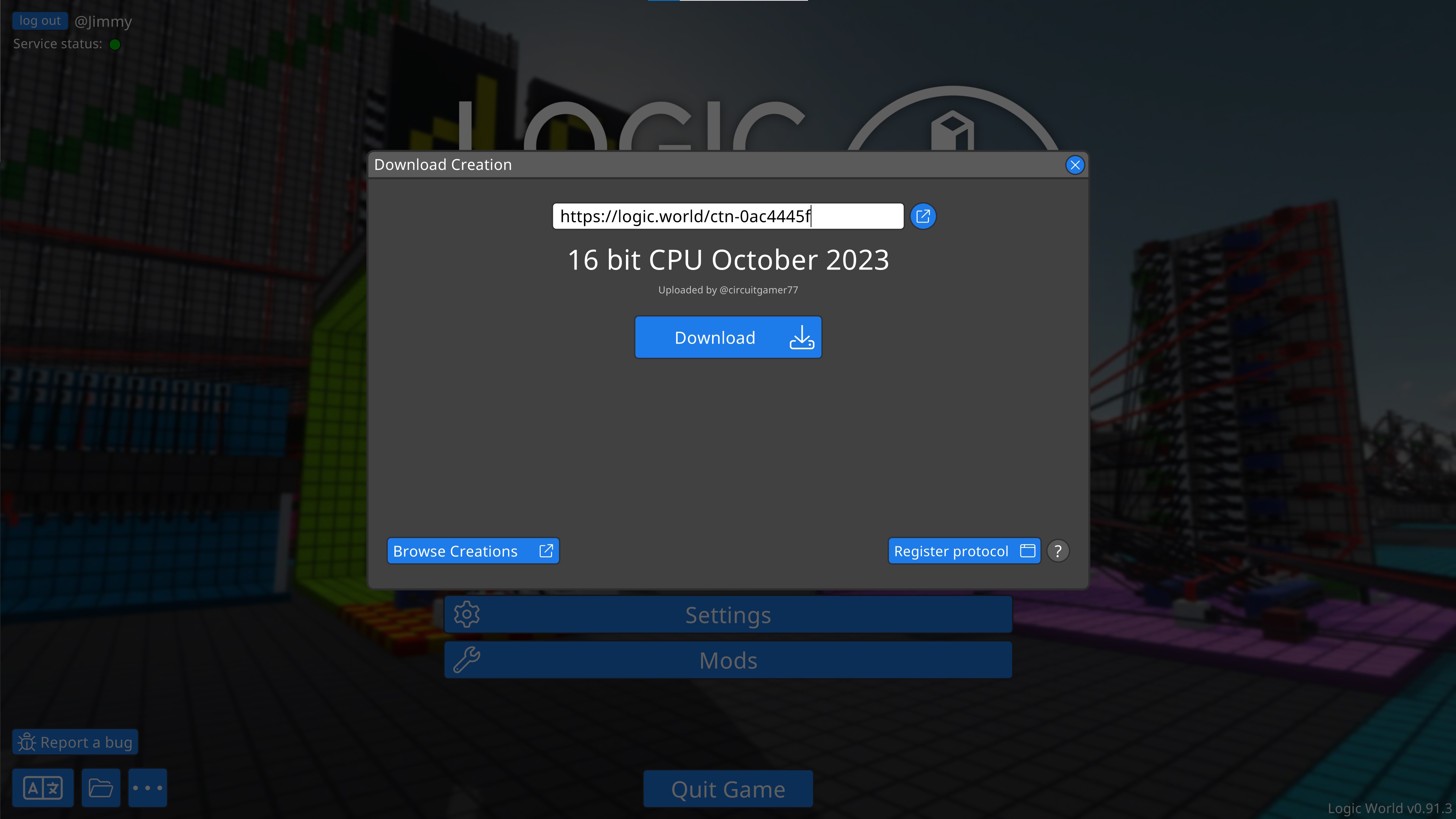 - Added a protocol handler: `logicworld://` links now get opened by the game, allowing quick and easy downloading of Creations. For this to work, you first need to click the "Register Protocol" button in the Download Creation Menu.