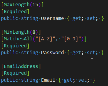 The problem is that in order to enforce these same rules on the client, you’d have to manually check the username’s length, use a regex for the email, etc. Ideally these same rules would be transferred to the client and automatically applied, so that you’d only have to specify the requirements once. This is exactly what my new library vue-aspvalidate does! It allows you to validate inputs on the client and the server while only writing the requirements a single time on the server class.