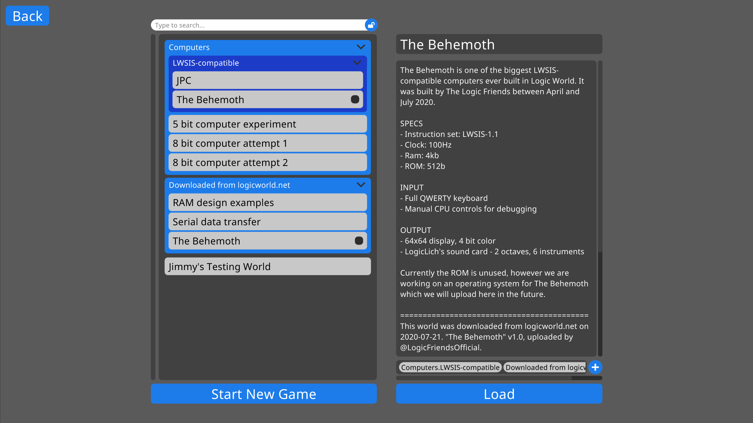 Now that the integrated server is working, I’ve been working on menus for using it in singleplayer. The Sandbox Menu uses the same code as the Save Board and Load Board menus, so each world can have a title, a description, and a series of tags for sorting it. The list of saved games can also be searched.