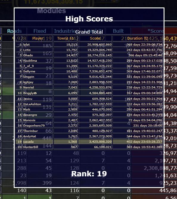 To get to the high scores, click on the left hand "Towns Completed Trophy" on the money window (F2) and hover over any of the blue, red or green columns. It may take a second to first download a result.