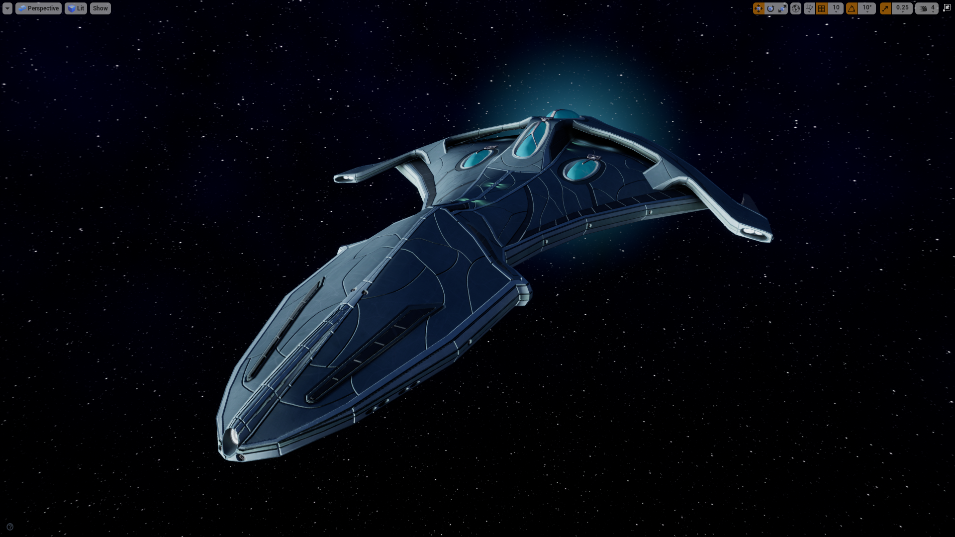 Selach ships also have a separate animated material for the fluid inside. There is a slight emissive glow and fluid flow animation. Finally, the smooth lines on their ships are visible in the normal maps and parallax occlusion maps that help details pop out more on their ships.