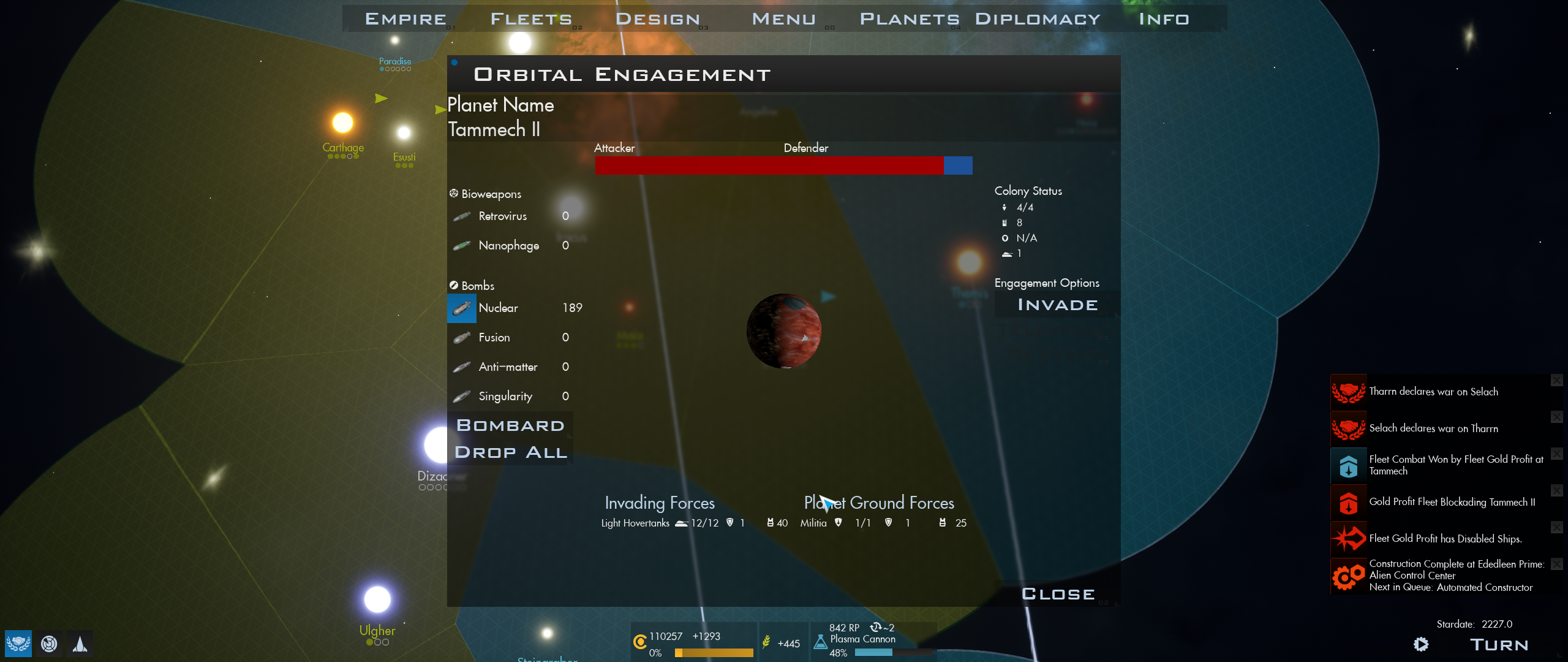We are hoping to be a week or two away from implementing several long term quality of life changes we have discussed in the past based on user suggestions including an auto button in ship designer to automatically generate ship designs, and removing auto ship design generation after research. While the current system is similar to Master of Orion 2, many wanted more control over designs. We’re also working on having Empire menu bring up a build menu within galaxy menu instead of jumping to planet view, and better sorting within empire menu.