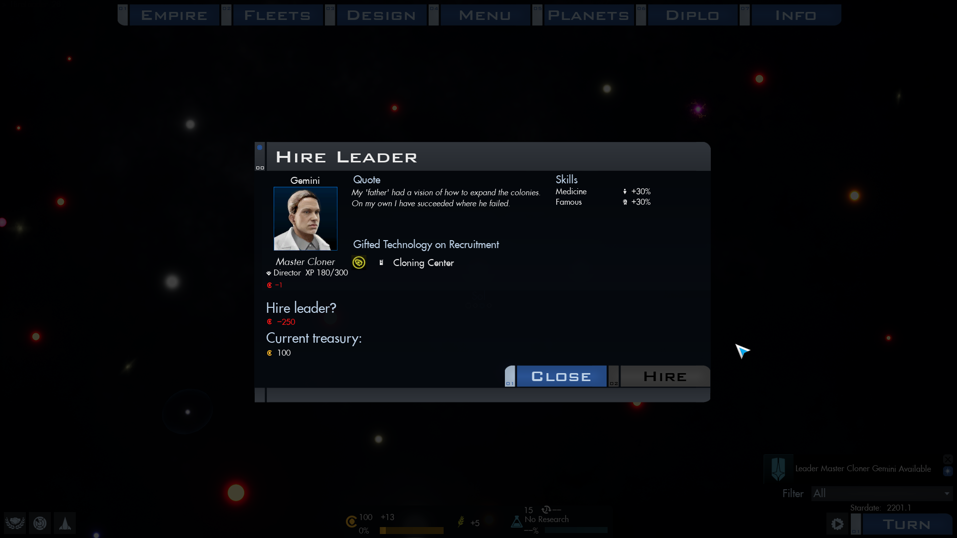 Gemini started as a science experiment for long term human colonization and expansion, but became a researcher in his own right expanding on cloning technologies. He and a Rigelan leader are both available in the leader pools of new games.