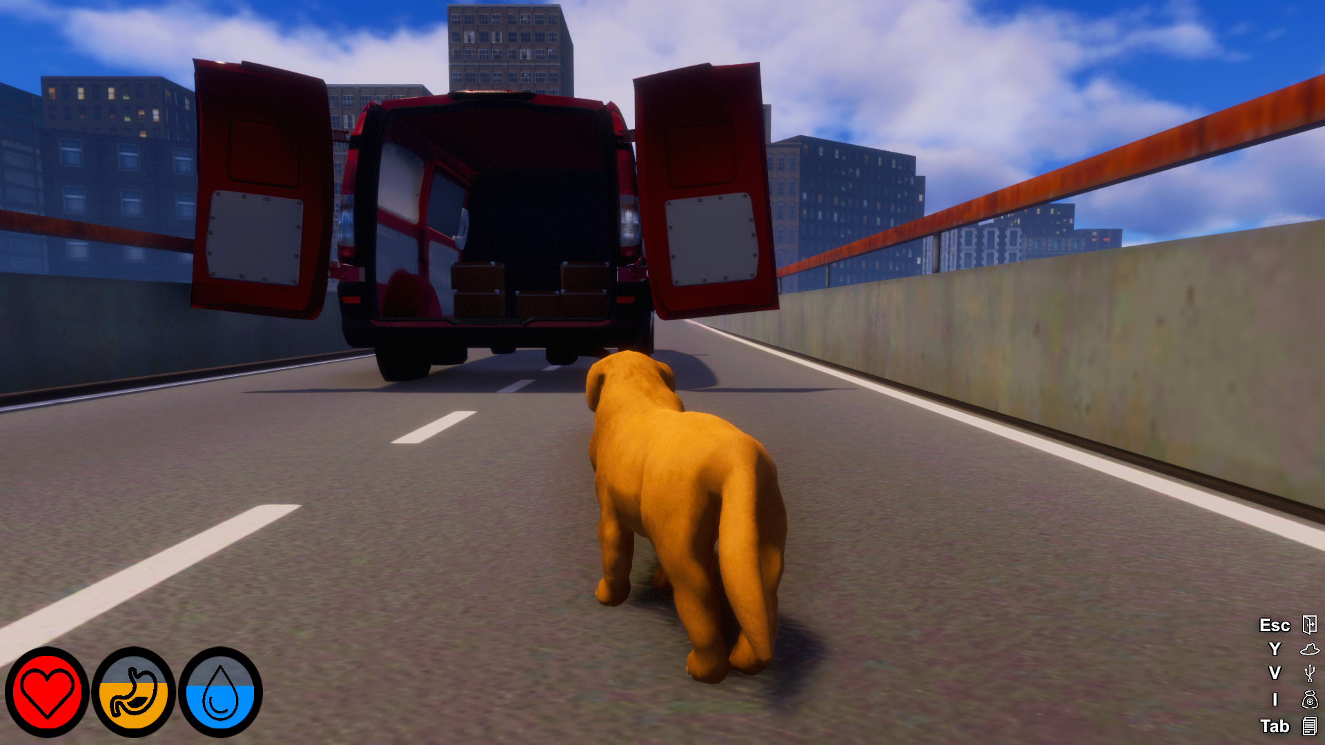 The most impactful change to the game is the breakup of the giant overworld scene into smaller scenes. While this does add a couple of loading screens into the environment, it actually reduces transit times on many computers and of course massively improves performance. We now have scenes split into the various districts of Doggo City and Beaver Town. This change vastly reduces loading times, reduces rendering costs due to less being in each scene, and most importantly reduces RAM and VRAM requirements slicing it as much as half in some cases. New transits points are now in the game which can be accessed at the old crossing points to go from one scene to another. Here is a sample of the new van on the bridge: