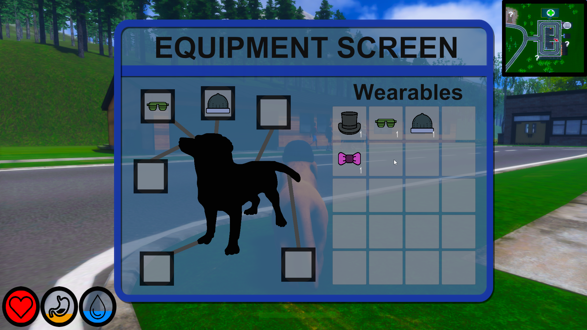 This panel is the equipment screen. From here, you can store hats, glasses, and even shoes! All these new cosmetic types are called Wearables and allow you to give your doggo a unique style. When you equip them, they will be assigned to the corresponding slot and visible on your doggo. You can click on the Wearable again to unequip it. These slots are totally separate from the main inventory, freeing you to explore your doggo's best style unhindered!