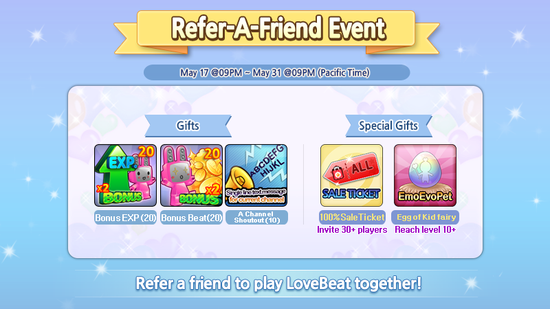Special Gifts - 5 players who invite 30+ friends will receive a 100% off coupon. - If new players who participate in the event reach level 10+ before the event is over, both they and their inviters will get a Egg of Kid fairy. (total 10 players only) * The special gifts are delivered to winners' inbox after the event is over.
