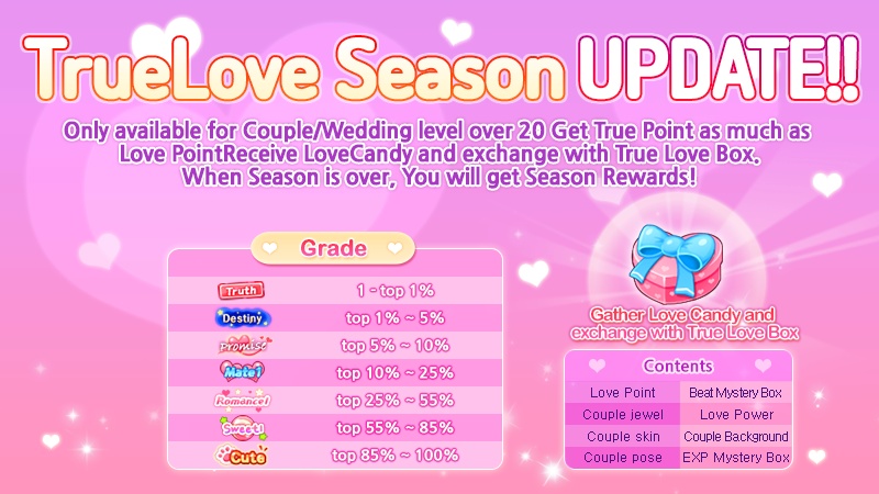 New contents for all Couples. TrueLove Season will update this maintenance. Whenever your couple point goes up, you will get TrueLove point too. When every season is over, you will receive rewards by grade.