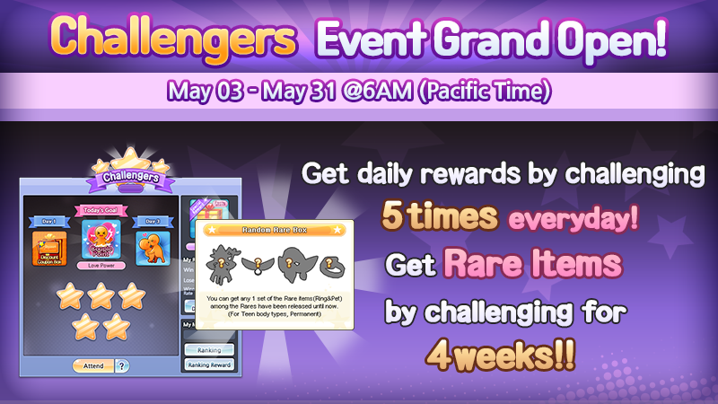 Challenge for 5 times everyday for 4 weeks, and get the Rare items & many rewards until May 31(Pacific Time)!