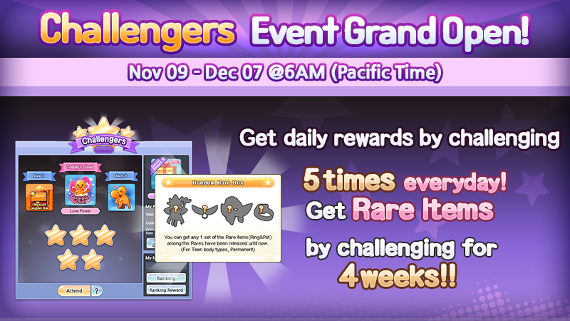 Challenge for 5 times everyday for 4 weeks, and get the Rare items & many rewards until December 7 (Pacific Time)!