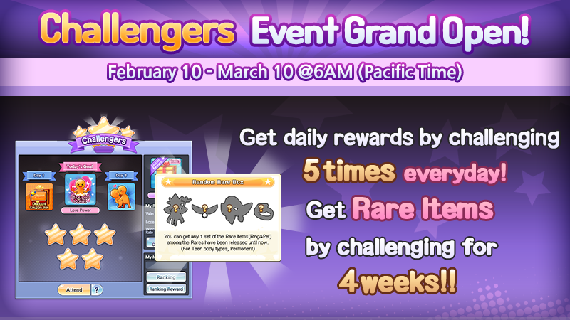 Challenge for 5 times everyday for 4 weeks, and get the Rare items & many rewards until March 10 (Pacific Time)!
