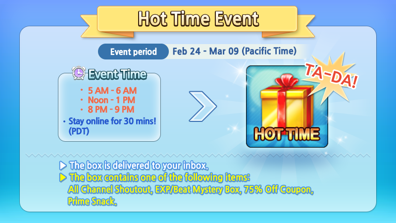 Hot Time Event starts! Stay online for 30 minutes during the event period below and get a Hot Time Box which contains one of the following items: ‘All Channel Shoutout’ ‘EXP/Beat Mystery Box’ 75% Off ‘Sales Ticket’ ‘Prime Snack’!