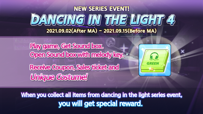 Dear players, it’s final update of “Danciing in the light” event. Please enjoy new songs and get special reward!