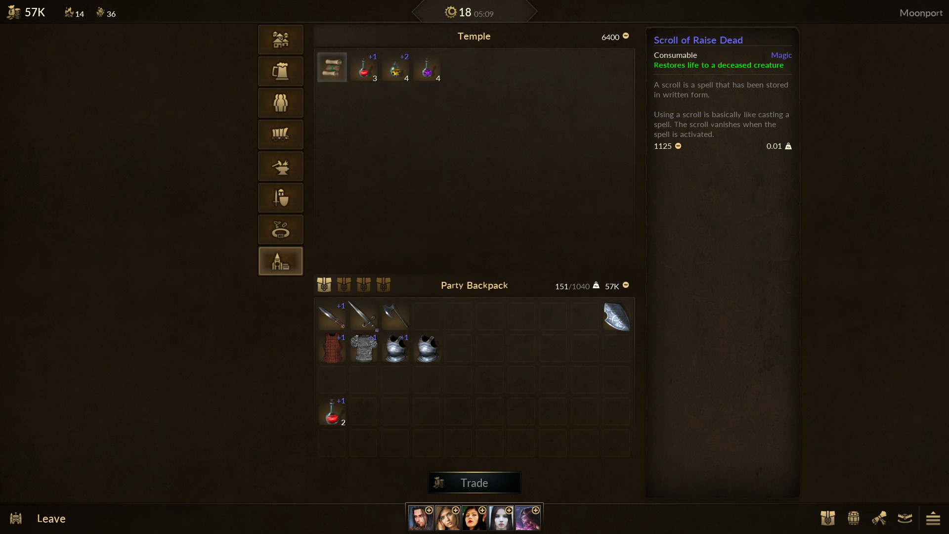 Every adventure party is initially equipped with the default trading goods delivery method that provides the carrying capacity usually ten times the base carrying capacity of party. With the adventure goes on, the party can obtain or upgrade to bigger storage and supporting delivery methods.