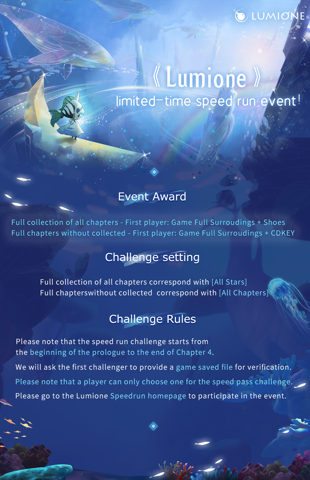 Lumione speedrun Event is coming!!! Which Challenge is suitable for you? Come on and record your speedrun on our website: https://speedrun.com/lumione Click the full picture below to see more details!