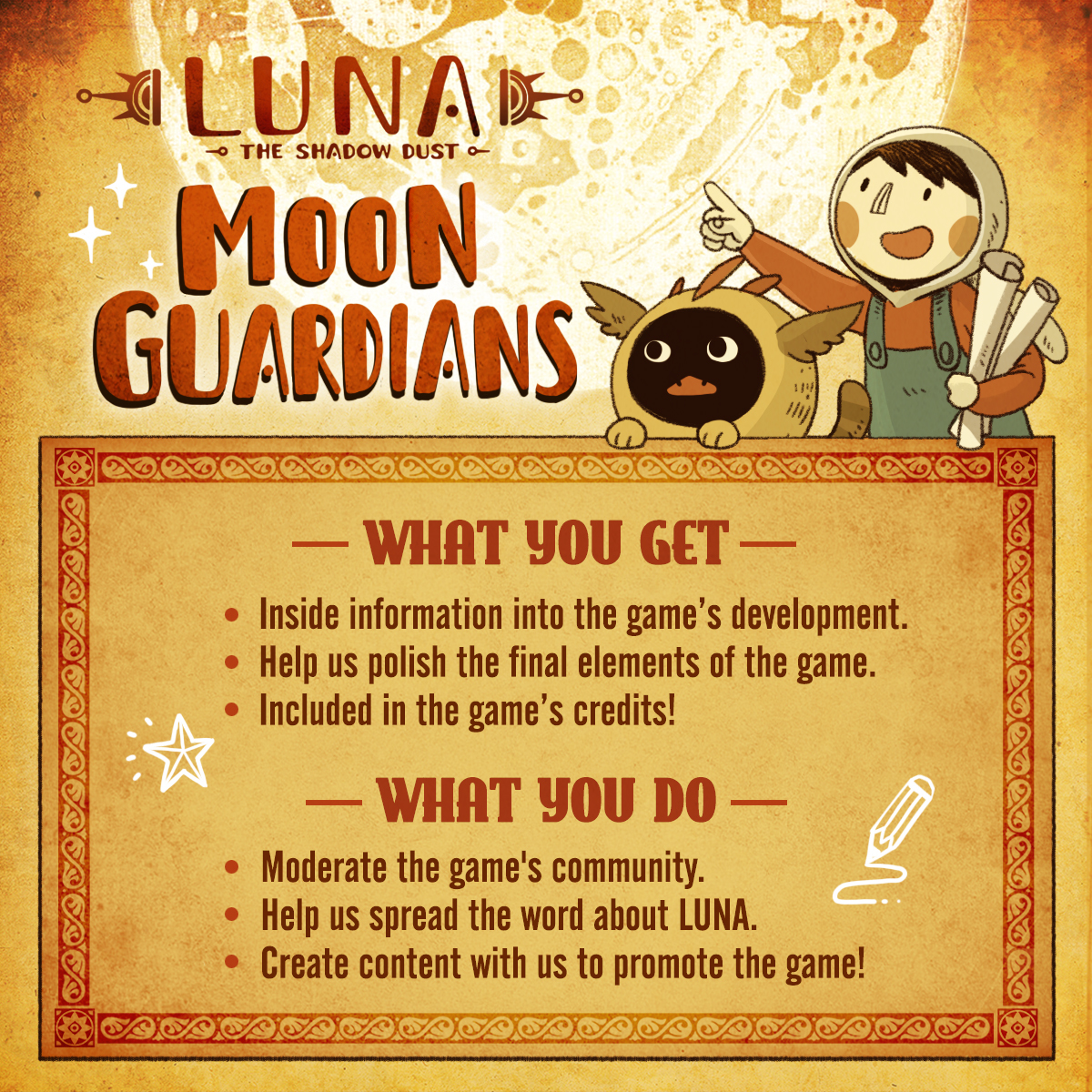 Become a Moon Guardian and gain inside information into the development of LUNA The Shadow Dust and help shape its development, in exchange for helping us grow the community and spread the word about the game!