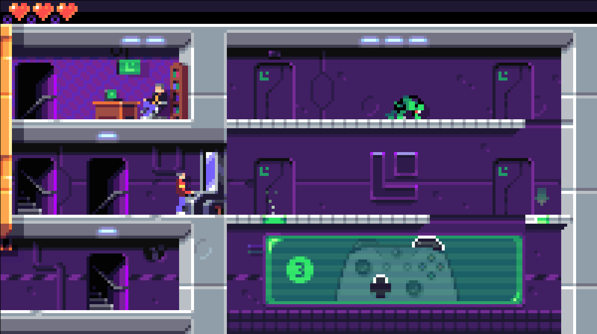 As events progress, Leo finds the factory under lockdown, and he must use his acrobatic skills to help the workers escape by unlocking the emergency exit. To do so, he’ll journey deep into the recesses of the factory and deal with numerous security measures: he’ll have to reset alarms to prevent doors from auto-sealing, dodge moving laser beams, avoid explosive traps on both floors and ceilings, and even fight armed security robots and probe drones. On the plus side, if you keep an eye out, you just might find a way to upgrade Leo’s weapon.