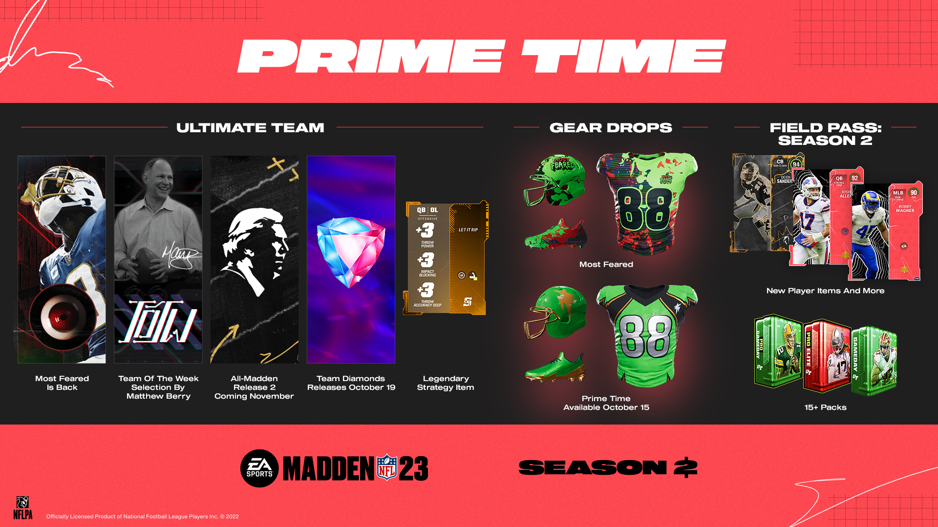 NFL great Deion Sanders earned his Prime Time nickname through a unique blend of speed, ferocity, and a personality that shined under the lights. Boost your Ultimate Team with terrifying new player items in Most Feared, complete challenges and earn Prime Time rewards in the Season 2 Field Pass, and hit the field in style with themed gear drops throughout the season. *Requires Madden NFL 23 (sold separately), all game updates, internet connection, & an EA account.