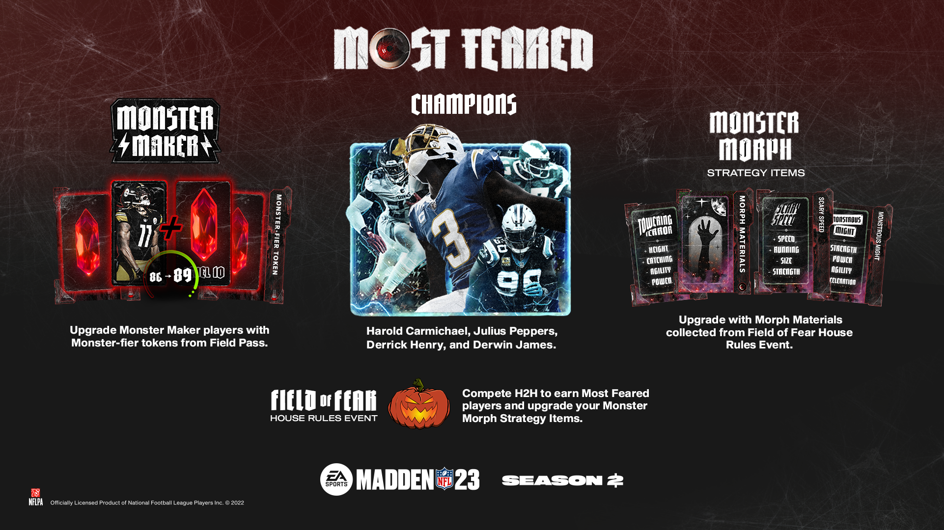 Most Feared is back with all-new players and strategy items sure to help you create the most terrifying Ultimate Team yet! Most Feared Champions will be released throughout the event, and four Monster Maker players can be earned exclusively through the Field Pass. Upgrade Monster Maker items into your own custom horrors with Monster-fier Tokens that can also be earned through Field Pass. Monster Morph strategy items also make their return, including Scary Speed, Towering Terror, and Monstrous Might. Get Monster Materials through the Field of Fear House Rules event that can be used to upgrade your Monster Morph items.