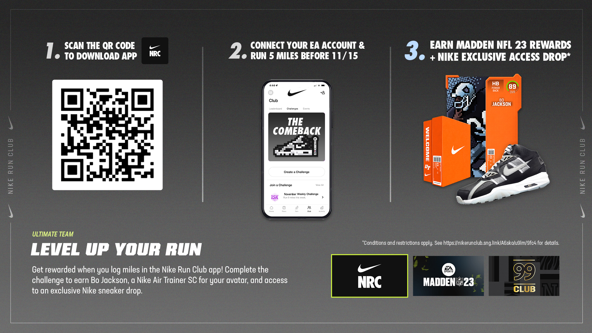 Log in or download the app and create an account, link your EA account, and log 5 miles by 11/15 to earn the Bo Jackson Ultimate Team™ player item and Nike Air Trainer SC cleats in The Yard.* But that's not all! You can also score a physical pair of the same cleats exclusively reserved for you in the Nike app.
