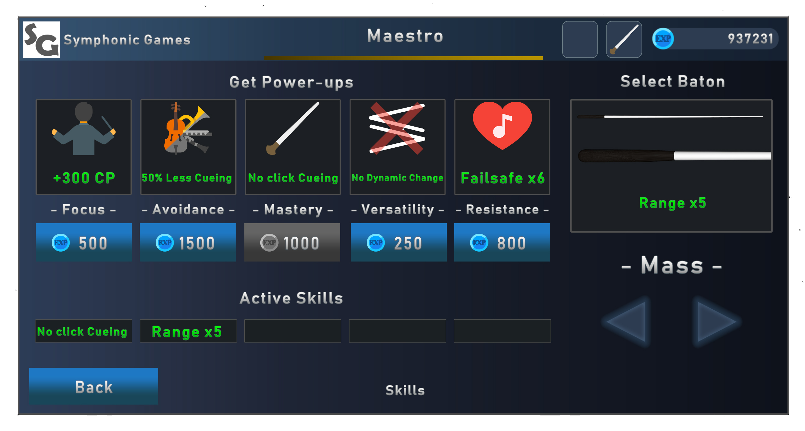 Welcome to patch 1.2! This update brings some important gameplay changes (Power-ups and new Skills) and many improvements. We have taken a little longer than we had planned for this update, but after a lot of testing it is here and we hope you enjoy it. We have also added the first movement of Beethoven's Symphony No. 5. We know you're looking forward to conducting new pieces and we've been working hard on it. We make each piece sound its best and offer a 100% score-based conducting experience. It is a handcrafted work of musical synchronization that has taken us a little longer than planned, but we already have several pieces of music almost ready to add to the repertoire within the next few weeks. The main changes in this update are the Power-ups. As you well know, batons provide skills that help conducting. Now, in exchange for experience, temporary skills can be added for each concert. For example if you activate "Maestry" power-up during a concert you won't have to click the ensure entry by instrument. By using baton skills with Power-ups, the conducting experience will be totally different at each concert and will adjust to the conducting style of each player.