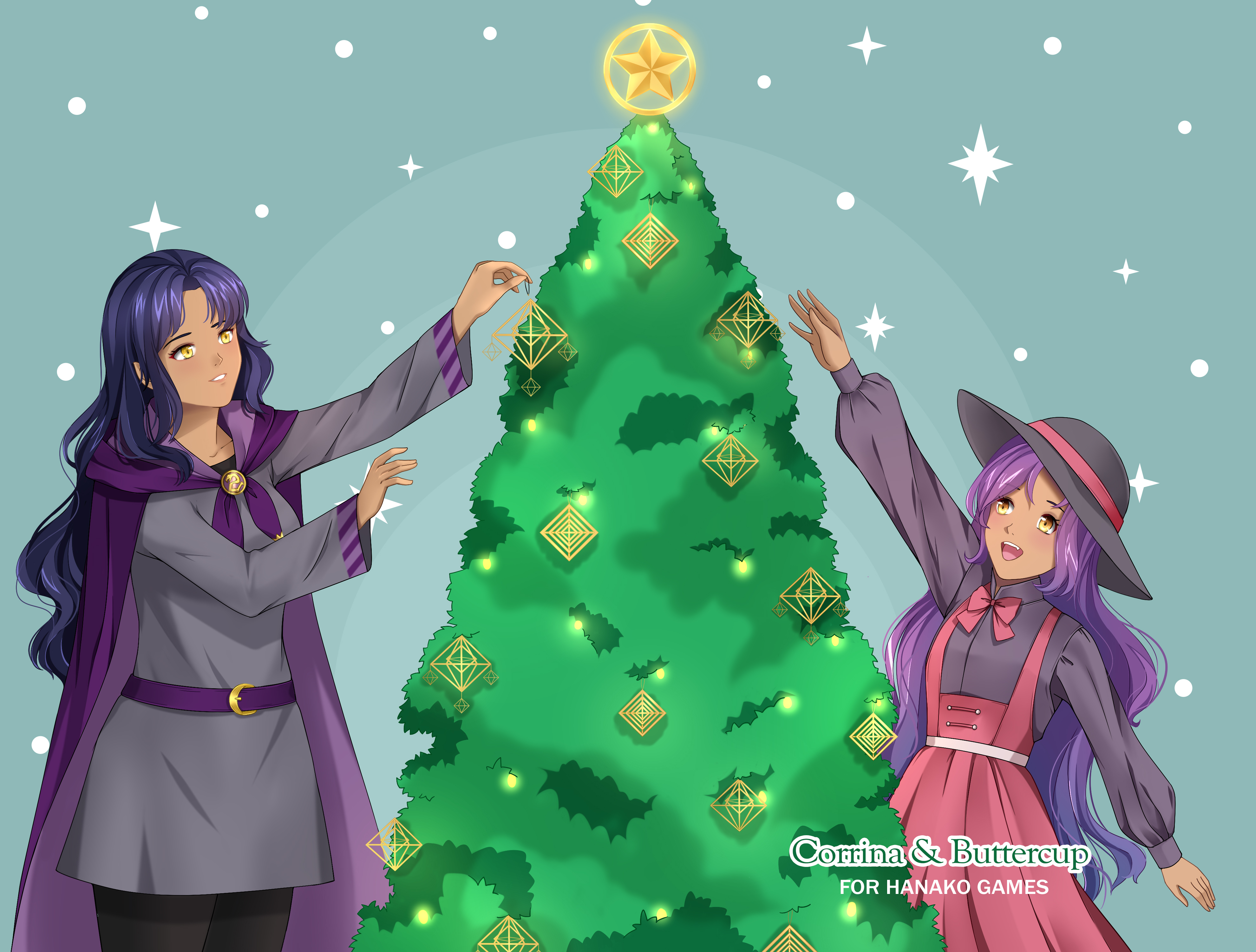 The end of 2021 is approaching! I hope you've all had at least a few good things happen to you this year, despite the struggles we've all faced. To celebrate the season, some bonus artwork featuring Corrinna from Magical Diary and the little vampire Buttercup from our latest release, Cute Bite, decorating a tree together: