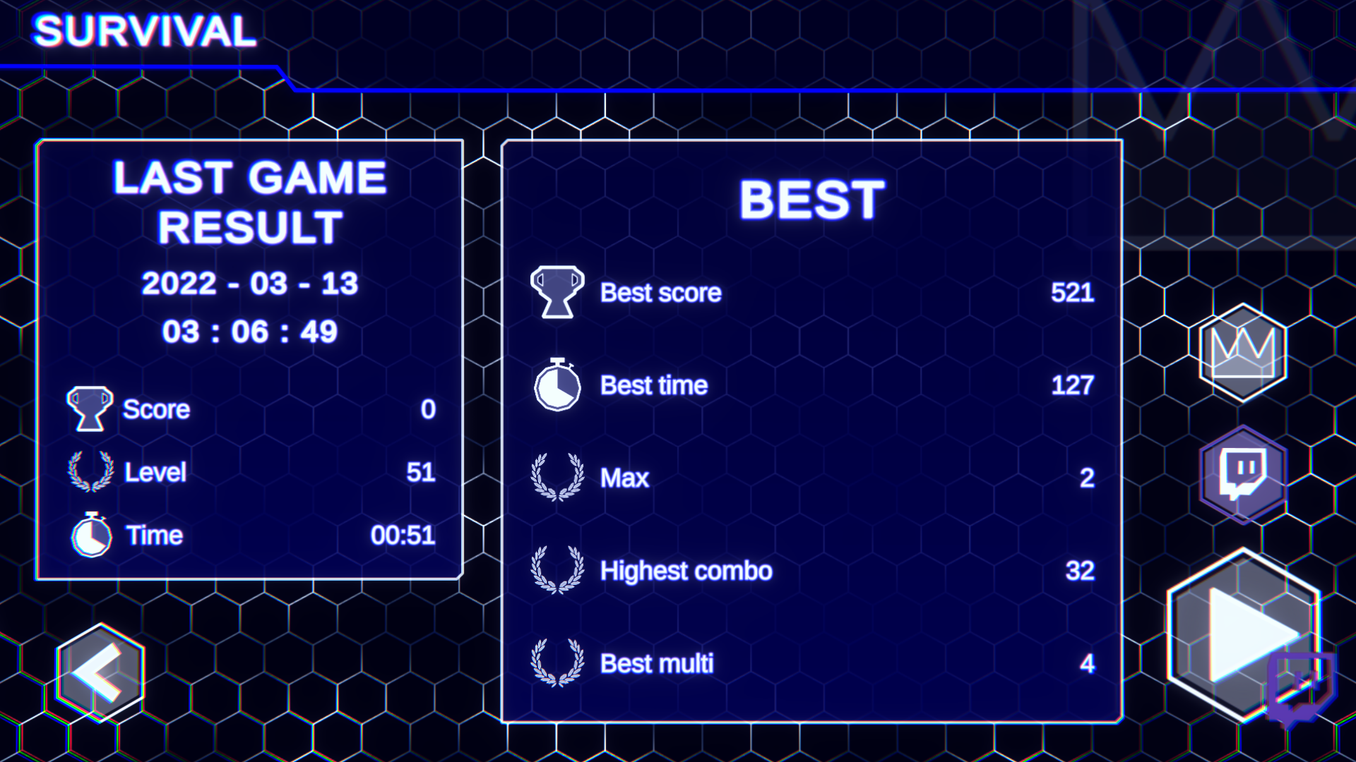 As long as your score is increasing, you will reach a new survival level which offers you the possibility to choose a bonus. I will not give you more information and let you discover the game mode.