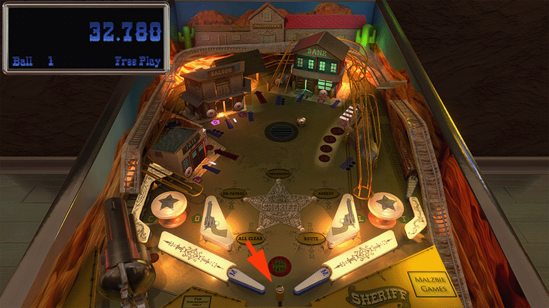 This table is still one of the most difficult tables, because of its pop bumpers. But I’ve made a moveable center post. After you shoot into the bank building, the post will move up when the ball is released. It stays there for some seconds and goes back again. This prevents you from losing the ball through the flippers. Overall the table is easier now.