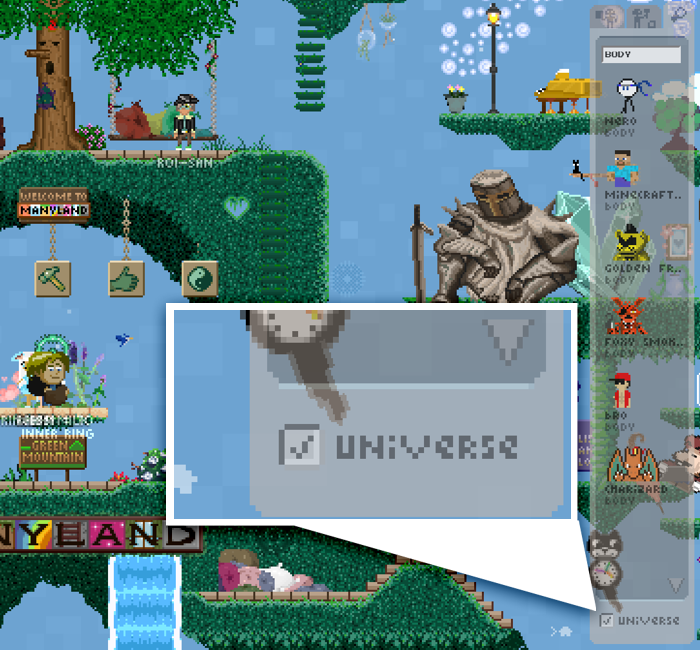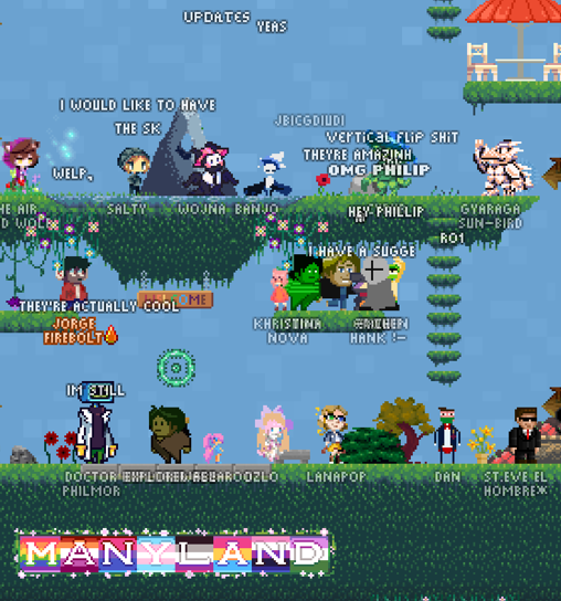 Manyland is now live on Steam! Manyland is an open 2d sandbox universe... where we create new things by drawing them, build new places, hang out and chat, collect, make music, party, script objects, go on adventures... and have fun together in ways none of us can predict.